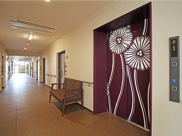 コンセプトカラーの紫に、大胆なスケールで配されたkioiデザイン。自由なスケールとカラーで出力できる、デジタルプリントの特性を最大限に活かしたインテリアは、移動の為の「機能」であるエレベーターに「デザイン」を取り入れ、施設のコンセプトを象徴する空間に。