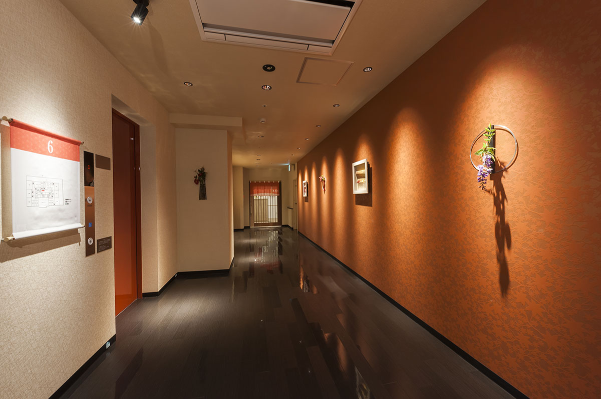 屋上のデッキから望む宮島の鳥居を思わせる朱色をアクセントにしています。エレベーターホールの壁面に、目にも鮮やかな一面の紅葉柄が出迎えます。ベースにはほんのりとゴールドのパールがきらめきます。
