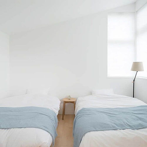 寝室と水廻りにグレーのアクセントクロスを使った施工例をご紹介します。