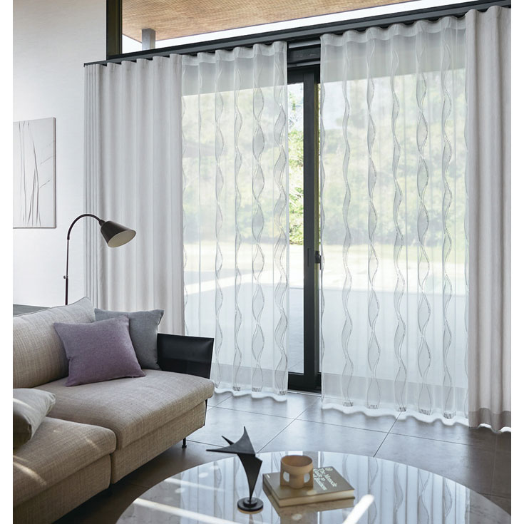 ゆったりとしたタテ流れの柄を細やかなステッチで表現した、総柄の防炎エンブロイダリー。お部屋を一層上質に彩ります。