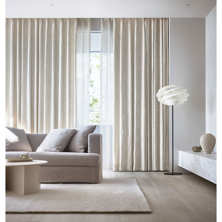 シンプルなジオメトリック柄を高密度で繊細に表現しました。ボリュームを抑えた明るい配色は、大開口の空間にもおすすめです。