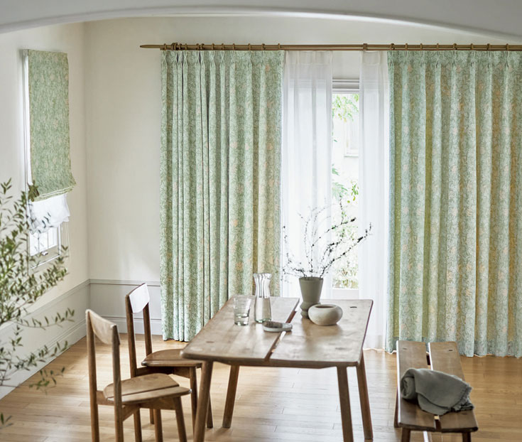 カーテンではクロスの爽やかな印象を保ちつつ、多色の先染ジャカードであらゆる箇所に工夫を凝らして表現しました。ジャスミンの葉が描くゆったりとしたラインをツヤのある糸で上品に描いています。