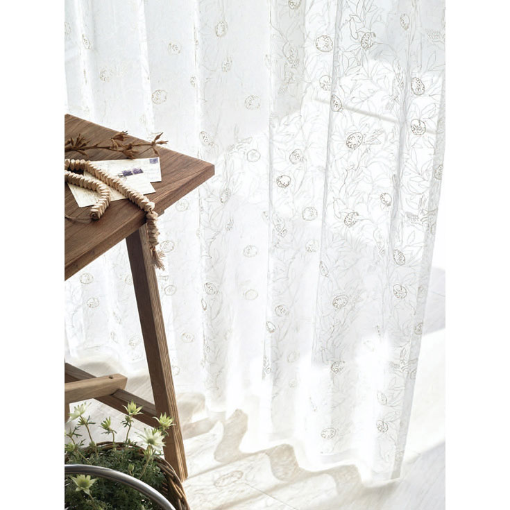 カーテンではこの柄を総柄のエンブロイダリーで表現しました。手の込んだ刺繍とナチュラルな素材感は当時のクラフツマンシップを感じさせます。