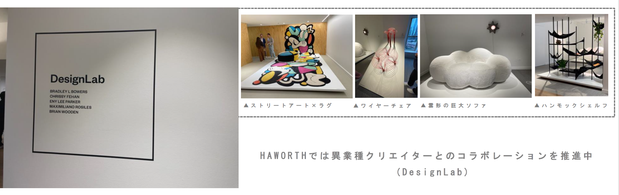 企業文化を理解し、従業員のモチベーションアップを目指したオフィス家具をつくるHAWORTH(ヘイワース)では、デザインラボを設け、異業種のクリエイターとのコラボレーションを行っていました。これまでのオフィスでは見たことのなかったユニークなアイテムは、HAWORTHのデザイナーはもちろん実際に使用するワーカーにも刺激を与えるはずです。