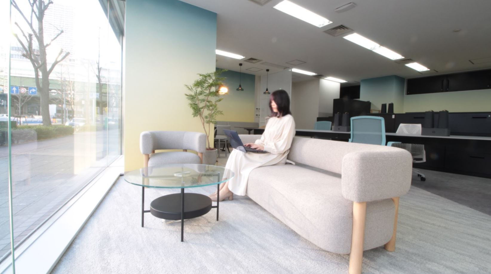なにわ筋通り道沿いに向けて広がるソファエリアは、ロケーションを活かして家具を外向きにレイアウト。ガラス張りで外の様子が間近で感じられるため、リラックスした状態で仕事が捗り、会話創出にも繋がる。